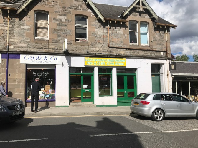 I discovered Pitlochry had a Chinese take-out restaurant and I was Jonesing for it big time. As I said I have not been eating. Can’t force myself to take in as many calories as I need. But Chinese? I could eat Asian food five days a week and the other two? Chow Mein.