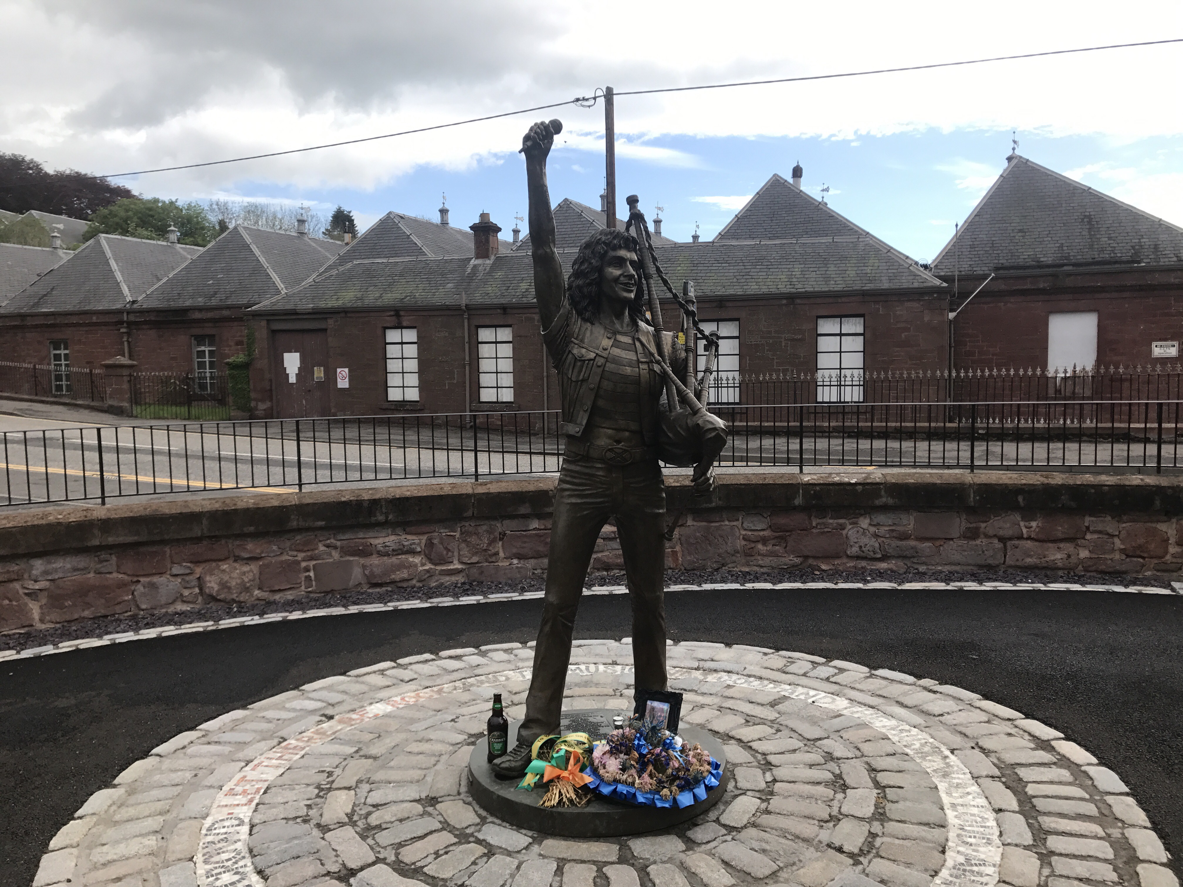 It’s for Bon Scott (1946-1980), lead singer in AC/DC. Apparently, Peter Pan was not the only boy from Kirriemuir who refused to grow up.