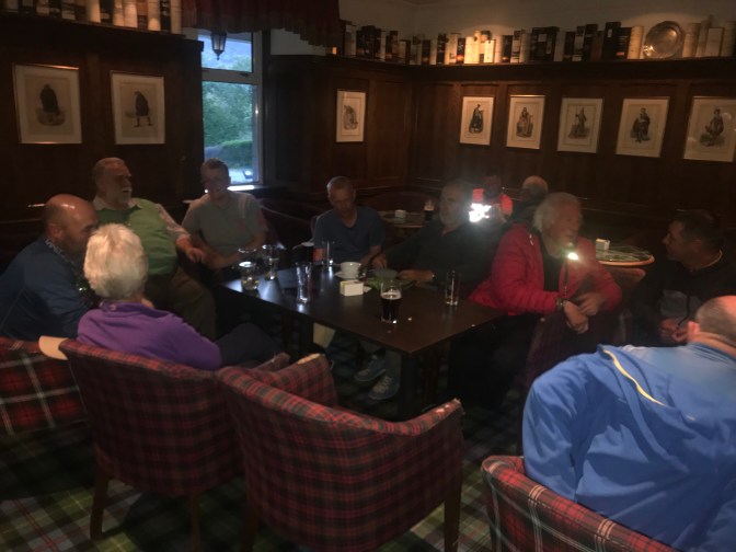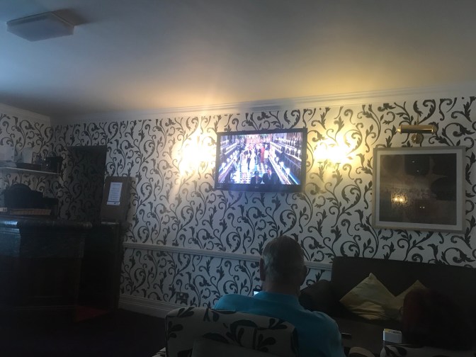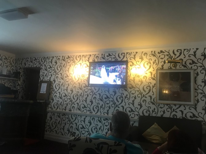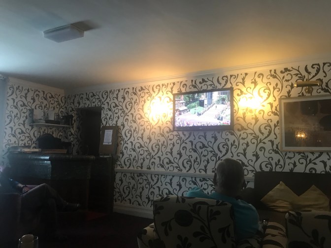 Braemar has no proper pub, a befuddlement to an otherwise lovely village. So those of us interested in watching are gathered in the lobby of the Invercauld Arms.
