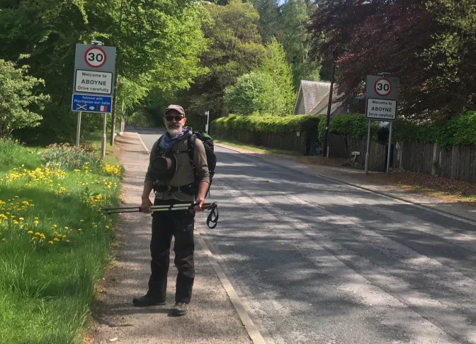 Up and on the road by 09:15, a lovely path along the River Dee, that goes all the way to Aberdeen, on the coast. It is an old railway bed and level as it can be. A quarter of the way down the path, I came up to Mick, and he and I walked together into Aboyne.