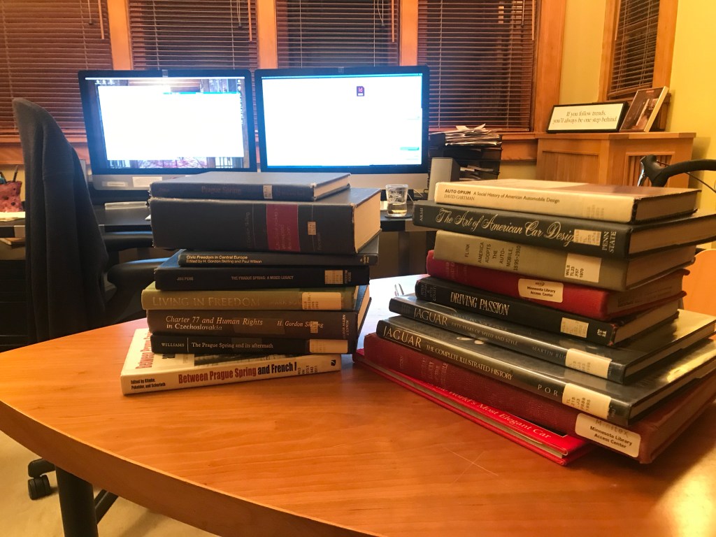 Only have time to write few sentences. i have a short paper due in the A.M., much reading and two bigger papers, as defined by the two stacks of books below that I need to review, as I mentioned earlier. Plus a Shakespeare midterm next week, and more coming up.