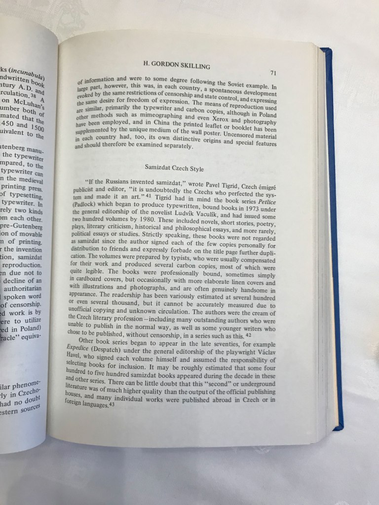 My History Question, which is like a hypothesis is; What role did samizdat “self-published” underground publications play in the aftermath of the Prague Spring? Yep, that’s my question and I’m sticking to it. There was this rich underground group of writers, artist, philosophers and generally bad-ass thinkers in Czechoslovakia who created a “parallel culture’ (polis). I will keep you posted.