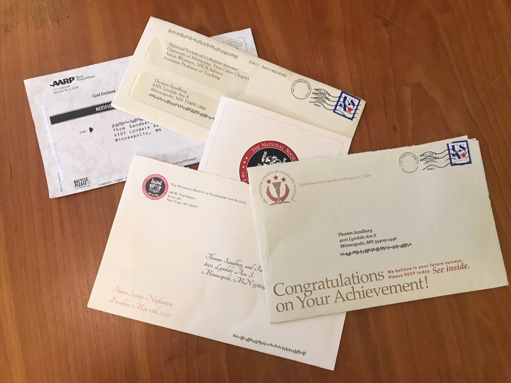 On the up side, I continue to receive solicitations to join a mired of scholastic leadership societies. I had no idea there were so many and so expensive. I anticipate they are looking for recruits to help them with all the misspellings in their letters. Today I received a few more along with one from AARP to join them. I am being worked from both ends.